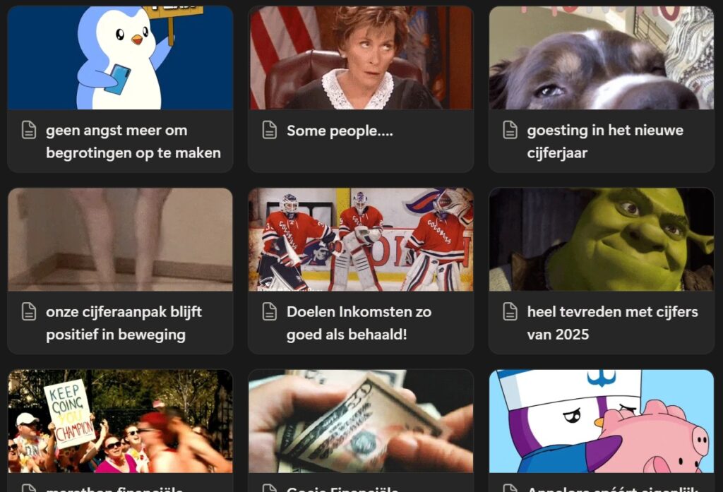 En nu jullie: Sluit het formele deel van de vergadering een kwartier voor het einduur af. Zet een timer op vijf tot tien minuten. Brainstorm los van elkaar over de verwezenlijkingen en inzichten die je te vieren hebt sinds de laatste keer dat jullie elkaar gezien hebben. Zoek per item een gepast gif-je. Deel al deze bewegende beelden met een korte omschrijving op een online plek die jullie allemaal kunnen zien. (Wij doen dit in een Notion-omgeving.) Nadat de wekker afloopt bekijk je samen wat de anderen hebben toegevoegd. Hilariteit verzekerd!